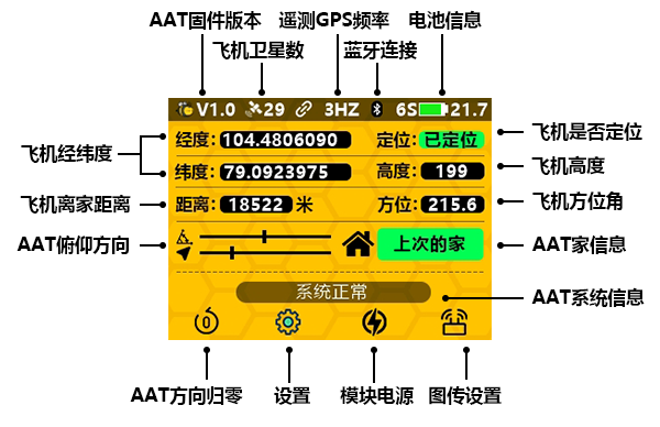 - AAT 屏幕首页显示信息包括主板版本、俯仰角度、家的位置、系统提示以及飞机的基本遥测数据。